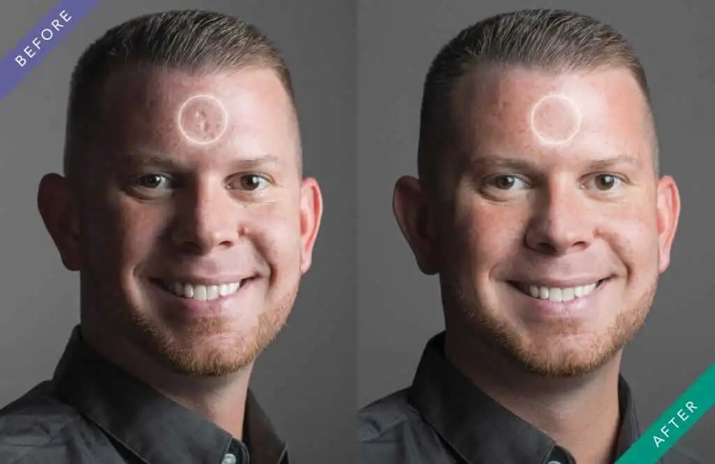 Acne scars can range from tiny ice pick scars that look like enlarged pores to a larger acne pock marks or box car scars. These before after scar photos show how Dermaflage can hide acne scars by filling in the scar and creating the look of smooth skin. Scars are visible for two reasons – discoloration and shadows from the uneven skin. Dermaflage addresses both issues with a thin layer of skin friendly silicone that resurfaces the uneven skin – hiding discoloration with a natural look that blends in seamlessly. See more acne scar before after photos.